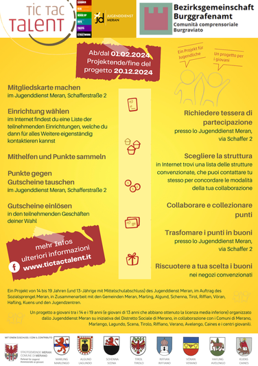 Das Projekt Tic Tac Talent bietet Jugendlichen von 14 (oder 13 mit Mittelschulabschluss) bis 19 Jahren die Möglichkeit, soziale und öffentliche Einrichtungen kennenzulernen und dort mit