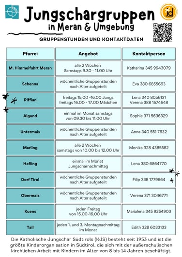 Der Jugenddienst Meran begleitet Jungschargruppen im Dekanat Meran Passeier. Alle Ortsgruppen sind Teil des südtirolweiten Vereins Katholische Jungschar Südtirols und orientieren sich im Großen und Ganzen an den vier Säulen des Vereins: Jungschar ist Lebensraum für Kinder; Jungschar ist Kirche mit Kindern;